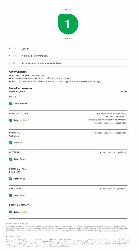 Aqua, Potassium Oleate, Potassium Cocoate, Glycerin, Potassium Palm Kernelate, Citric Acid, Potassium Citrate.